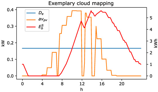 Standardized load profiles for German households [22,23] are used for the heat and electricity demands for the full model in Section 4.4. The time series based on those profiles are scaled to have a total electricity demand equal to the electricity-only model (24 kWh per day). The total heat demand is twice as large as the electricity demand (48 kWh per day). We assume the heat pump to have a coefficient of performance of 3. The heat pump’s power rating is large enough to cover the heat demand in every time step, making the heat storage optional from a pure heat balancing perspective. We use the mapping as described above with randomly distributed clouds and random cloud size.