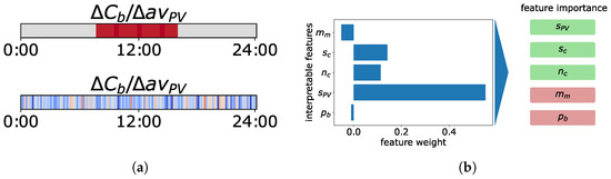 A visual representation of the methodology proposed for the explanation if ESD is shown in Figure 2b. The illustration is based on our exemplary building energy system from Section 2. An interpretable explanation for the cost-optimal battery capacity designed by the ESD model is created for a given set of input parameters, the POI . In the presented case, the POI is a summer day’s solar radiation time series. An interpretable feature space is then created. Interpretable features considered potentially relevant for an explanation are the specific battery investment cost, the number and shape of “fleecy clouds” occurring during the day, and the existence of “morning mist”. Interpretable variations around the POI are made, and the mapping maps the interpretable variations to the models’ input space , resulting, e.g., in variations in the solar radiation time series. The ESD model is then optimized for each variation. A linear model g is fitted to approximate the cost-optimal battery capacity of the ESD model’s results. The weights of the resulting linear model g are taken as an interpretable explanation for the ESD model. A weight in g corresponding to an interpretable feature represents that feature’s influence on the ESD model’s output. In the given example, the most relevant interpretable feature for the ESD model’s cost-optimal battery capacity is the size/duration of the “fleecy clouds”.