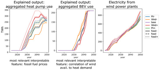 The transportation energy provided by BEV for different input variations is shown in the center graph of Figure 5. The most relevant interpretable feature for explaining the transition towards BEVs is the correlation between wind power availability and heat demand. If the wind power availability is less correlated with the heat demand, a transition towards BEV happens earlier. If the wind power availability is correlated more with the heat demand, the transition happens in later years.