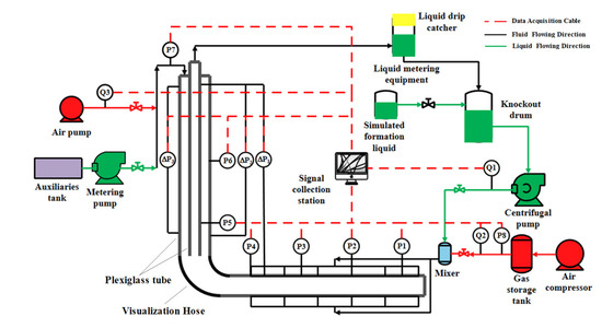 In order to compare and analyze the liquid-carrying capacity of gas flow in various sections of the horizontal gas well, as well as to study the gas–liquid phase flow law of the horizontal gas well under various tubing depths, the multiphase flow experimental equipment that was already in place was redesigned and upgraded. The horizontal gas well simulation device had the precise discharge metering equipment, gas injection equipment, foam addition facilities, etc. Figure 2 displays the schematic representation.