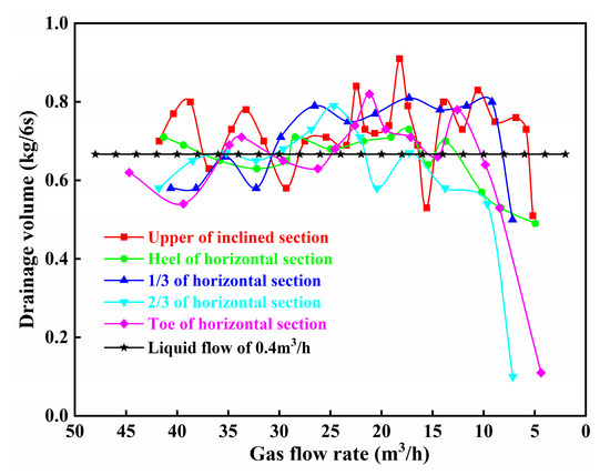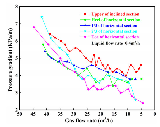 Figure 6 indicates that if the tubing reaches the heel of the horizontal portion or deeper regions, the gas flow needed for liquid transporting can be relatively little when the produced liquid rate is relatively low. At this point, the sloping segment is the most challenging area for transporting fluids. The tubing diameter of the fluid flow can be effectively lowered when it reaches the heel of the horizontal portion or deeper regions. The gas flow rate in the small-diameter circulation channel is significantly higher under the same gas–liquid flow condition, and the liquid-carrying capacity is improved. As a result, the inclined section is easier for the gas flow to convey the liquid than the other sections. The tubing depth at the heel of the horizontal section can further minimize the gas flow rate necessary for transferring liquid, as shown in Figure 6, given that the produced liquid rate is modest. As a result, the annular gas chamber in the vertical section may have helped the preceding section’s gas drainage during the low liquid rate.