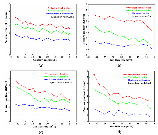 Pressure gradient of different sections with different liquid production rate: (a) top of deviated section; (b) heel of horizontal section; (c) 1/3 of horizontal section; (d) 2/3 of horizontal section.
