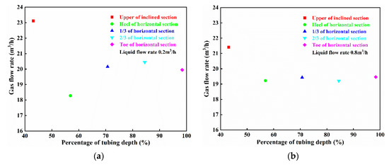 Gas flow rate of liquid-carrying in different tubing depths: (a) liquid flow rate 0.2 m3/h; (b) liquid flow rate 0.8 m3/h.