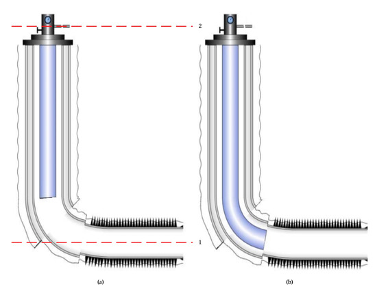 Well structure when the tubing reaches the upper part of the inclined section: (a) upper of inclined section; (b) heel of horizontal section.