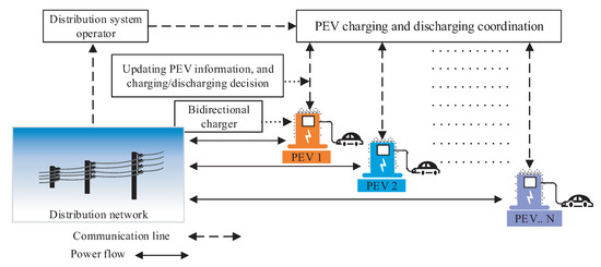 Furthermore, PEVs can provide a unique vehicle-to-grid (V2G) service due to having storage capacities. When PEVs are connected to the distribution network, power can be supplied to the grid [24] by discharging from PEV batteries. The conception of the V2G application may expand the performance of a distribution network regarding system efficiency, generation dispatch, reliability and stability [25,26]. An energy resources management strategy with PEV integration is proposed in [27]. Based on the electricity price, charging–discharging cost is calculated to find an economical operation of the system providing reserve capacity by PEVs. An event-triggered scheduling strategy for V2G operation is conducted to reduce the overall load variance in a smart grid [28]. To ensure the power transmission safety of branches, an optimization model of PEV charging and discharging is proposed in [29]. Moreover, this model also reduces load fluctuations and maximizes the PEV owner’s benefit. In order to optimally transfer power between PEV and the grid, the authors [30] recommended a multi-objective genetic algorithm model with the objective of voltage regulation and load flattening. Furthermore, an adaptive neuro-fuzzy inference system is implemented to maximize the use of storage from PEV batteries and minimize charging cost. Two PEV charging strategies with the objective of load curve shaping are proposed in [31] where a PEV charging and discharging coordination method are found to be more effective than only the charging method. A parking lot-based PEV charging and discharging coordination of PEV is studied in [32]. Different time periods are considered for the charging and discharging of PEVs such as charging when the energy cost is lower and discharging when the energy cost is higher. Through this strategy, the profit of the parking lot is increased.