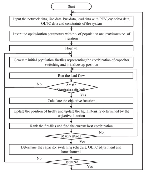 The flow chart of the capacitor switching and OLTC adjustment using BFA is presented in Figure 3.