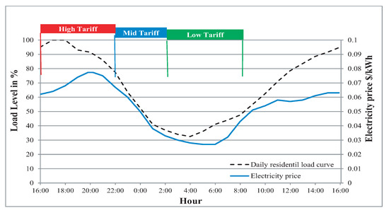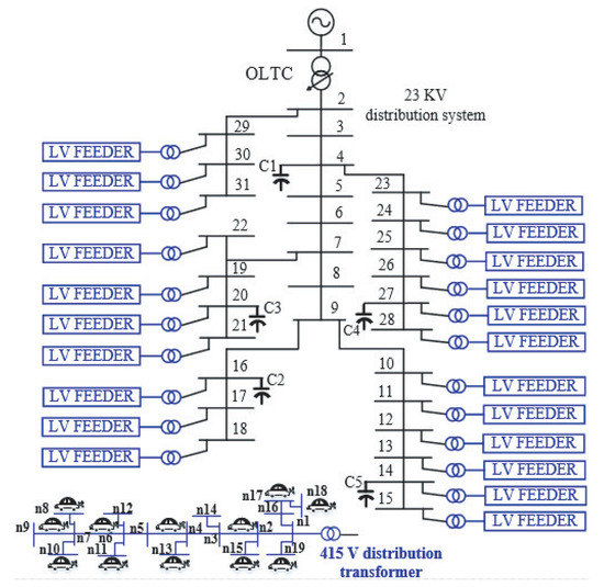 A smart residential distribution network formed with the modified IEEE 31 bus 23 kV distribution system is used to implement the proposed strategy. Figure 4 presents the single line diagram of the distribution system containing 22 low-voltage feeders with 415 volts. Each feeder is connected with nineteen nodes, and each node is considered as a residential load. The number of total houses in the system is 418, and the maximum load in each house is 2 kW. PEV is randomly connected in the low-voltage feeder, and one house can have a maximum of one residential PEV charging station. The daily load profile and TOU electricity tariff is taken from [16] and illustrated in Figure 5. Five switchable capacitors are used in this system. The capacitors’ location and corresponding capacity were taken from [5].