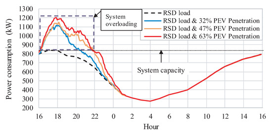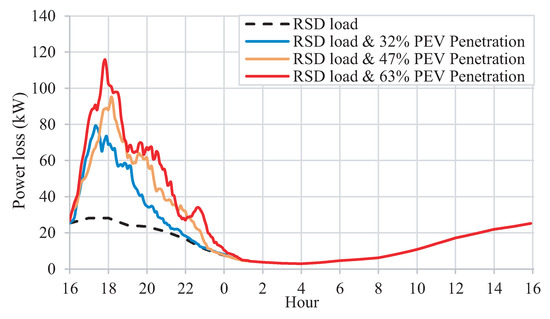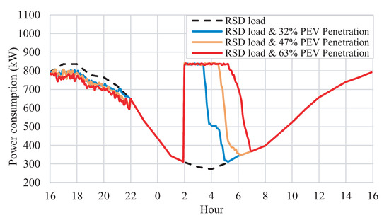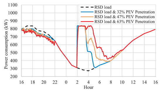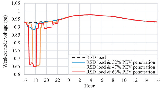 An approach considering a near real-time optimal charging and discharging coordination of PEV is presented in this case. Once at home, the PEV users plugged the vehicle in the charger located at their parking. However, PEVs will not start charging immediately. Based on the system constraints, an optimal charging or discharging coordination schedule will be allocated by the distribution system control unit, and after that, the decision will be sent to the bi-directional charging point, and accordingly, PEVs charging will be activated. The obtained results after applying the coordination technique are demonstrated in Figure 9, Figure 10, Figure 11 and Figure 12. The total power consumption is shown in Figure 9. PEVs participate in V2G operation from the hours 4.00 p.m. to 10 p.m., which reduces the power consumption from the substation. The charging activities of PEV start from the early morning at 2.00 a.m., and power consumption is always within the maximum capacity of the system. Figure 10 shows the power loss of the system: for instance, for 63% PEV penetration, power loss is decreased by 36.39% in contrast to uncoordinated charging. Moreover, in this strategy, the voltage profile of the system is enhanced. As shown in Figure 11, the voltage of the weakest node is 0.90096 p.u., which is within the lower allowable limit. The system cost is reduced by 7.96%, 12.44% and 13.48% for 32%, 47% and 63% PEV, respectively, with respect to uncoordinated charging.