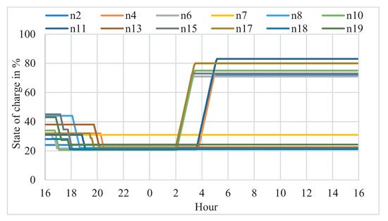 The SOC of PEVs of the weakest feeder is shown in Figure 16. After arriving at the residential charging point, PEVs participate in V2G operation at a high tariff time and start charging at a lower tariff time. It is seen from Figure 16 that all the PEVs of that feeder received full charge up to their requested level of SOC. No PEVs are left out in the system to receive charge, and customers are entirely satisfied.