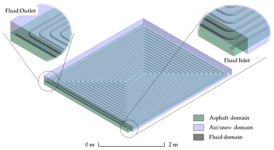 The 3D-CAD drawing for CFD simulations was created using the commercial software ANSYS Design Modeler. Geometric dimensions and material parameters of the heating circuit were modelled using an asphalt domain with a length of 3.8 m and a width of 3.4 m, i.e., an area of actual heating circuits of ca. 13 m2. The air domain—i.e., air flowing above the asphalt surface—had a height of 15 cm. The fluid domain—i.e., the actual pipes made up of PE-Xa with aluminum coating—was designed inside the asphalt domain as shown in Figure 5. All dimensions of the pipe component such as distance between the tubes, bending radius, number of turns, and depth inside the asphalt were used without down-scaling.
