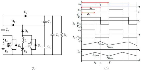 The TISO DC-DC converter circuit is shown in Figure 1a, with a variable input voltage source E1 and a constant DC voltage source E2. The circuit consists of two switches, S1 and S2; two inductors, L1 and L2; four capacitors, C0, C1, C2, and C3; and three diodes, D1, D2, and D3. Despite the fact that the converter may function in both continuous and discontinuous conduction modes depending on the inductor current levels, this work concentrates on the continuous conduction mode of operation. The switching waveforms and inductor current waveforms are shown in Figure 1b.