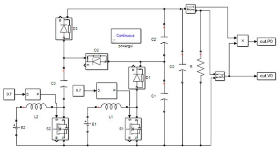 The parameters and designed component values of the converter are listed in Table 1. Figure 2 illustrates the MATLAB/Simulink simulation model for a basic TISO DC-DC converter with two fixed 18 V and 12 V DC input voltage sources. The duty ratios d1 and d2 are maintained at 0.7 throughout the simulation. Figure 3a illustrates the output voltage, while Figure 3b illustrates the converter power.
