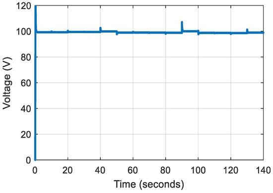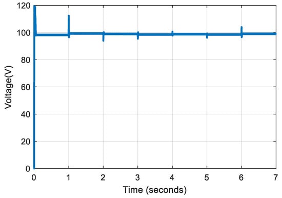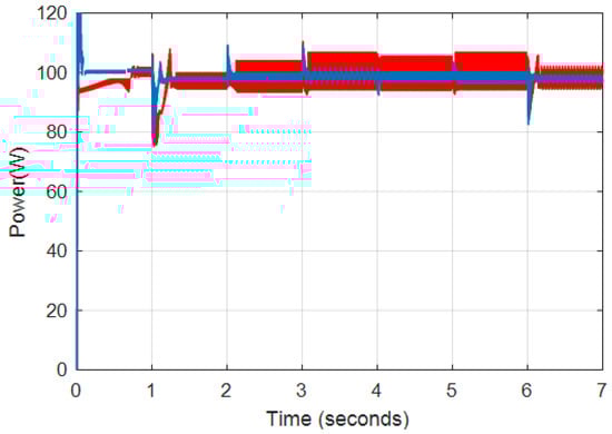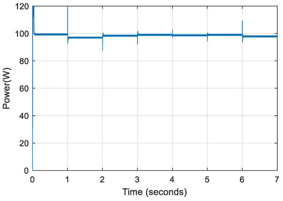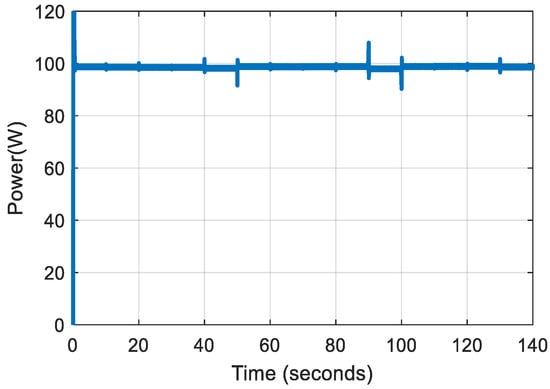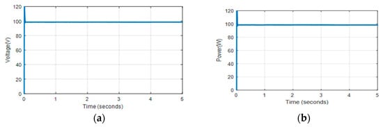 The average power calculated from the simulated output power curve is 98.49 W; hence, the converter efficiency is 98.49%. Using the simulation results, the voltage ripple and average output voltage are calculated to be 0.21% and 99.195 V, respectively. These figures indicate that the converter has greater efficiency and lower output voltage fluctuation. Losses due to passive components and solid-state switches influence converter efficiency. Power loss in MOSFETs is caused by conduction loss, switching loss, and body diode resistance. However, owing to the CCM mode of operation, body diode resistance losses are disregarded. Power losses due to diodes include threshold voltage loss, conduction loss, switching loss, and reverse recovery current loss, all of which are dependent on the output current, output voltage ripple, and switching frequency [20,22,23]. This study does not evaluate the influence of parasitic components such as trace inductances, parasitic capacitances, and semiconductors on efficiency computation, since this work is primarily focused on the system level rather than the component level.