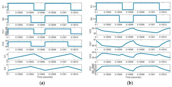 Figure 4a shows the simulated waveforms of the switching pulses of switches S1, S2, the inductor voltage, and the inductor current. The plots show that the results are aligned with the steady−state analysis plots depicted in Figure 1b. In Figure 4b, voltages across the capacitors C0, C1, C2, and C3 are shown.