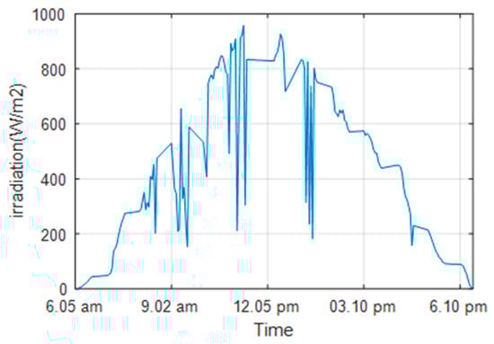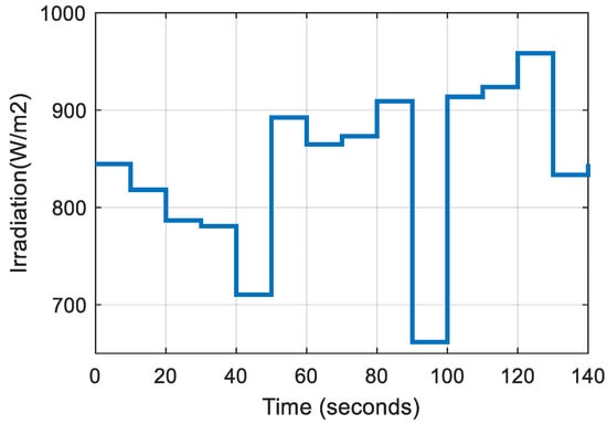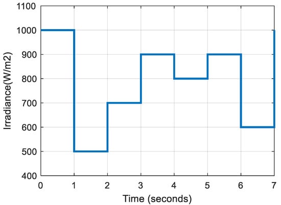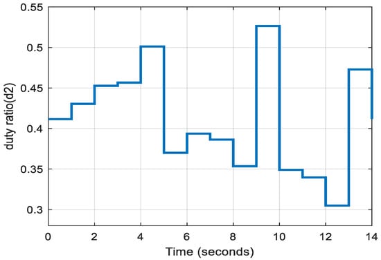 The circuit is simulated under various irradiance levels at a constant temperature (25 °C), as shown in Figure 7. Figure 8 depicts the change in the duty ratio of switch S1 corresponding to the changes in PV output. Figure 9 shows the duty ratio generated by the control circuit for switch S2 with respect to the changes. The converter’s output voltage and output power are depicted in Figure 10 and Figure 11, respectively.