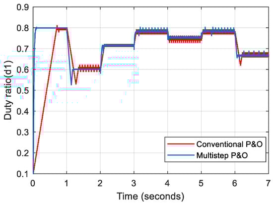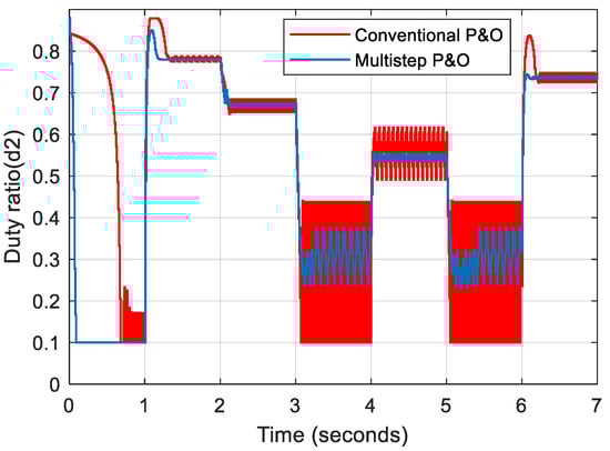 The circuit is simulated with the proposed approach for similar input conditions applied to the P&O and multistep P&O MPPT-based system (Figure 7). Figure 13 depicts the duty ratio generated by the linear line–slope interpolation algorithm given to switch S1 and the duty ratio produced by the proposed control architecture for switch S2. The voltage and power output of the converter are depicted in Figure 14 and Figure 15, respectively.