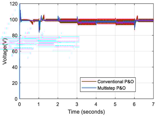 The average voltage and overall efficiency of the converter with the proposed controller are 98.9 V and 98.67%, respectively, and the average voltage ripple is 0.228%. It is evident from the results that the proposed approach is capable of tracking MPP much faster than the P&O tracking approach and the voltage ripple is significantly reduced. The ripple reduction is more than 90% when compared to 2.91% ripple generated by the P&O algorithm, and it is more than 85% when compared to 1.55% voltage ripple in the multiple-step-size P&O algorithm.