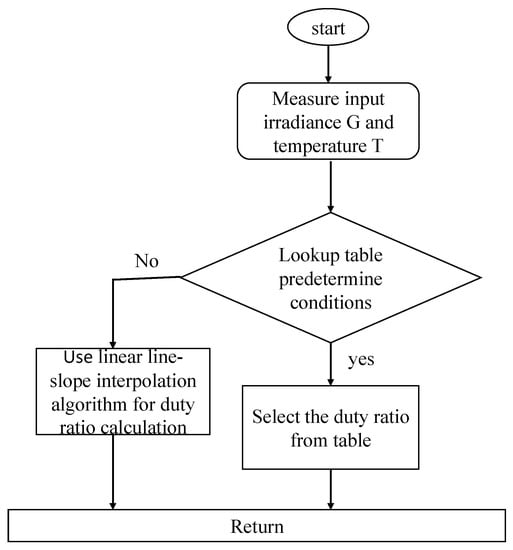 To overcome the ripple issue and to produce a more stable output, a simple indirect MPPT method with a linear line–slope interpolation algorithm is proposed. Figure 12 depicts the flowchart of the linear line–slope interpolation algorithm approach. The algorithm reads the input(s) and provides a corresponding output based on the preassigned values stored as an array. Duty ratio values are stored for each set of irradiation and temperature values for irradiation values ranging within 500:100:1200 W/m2 and temperature values ranging within 15:10:45 °C with a constant period of 10 °C, and duty cycle values are determined. A total of 38 sets of values are stored.