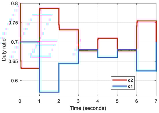 The circuit simulation is performed under the rapidly changing environmental conditions presented in Section 4.2.3 as input for the PV array. Figure 26 and Figure 27 illustrate the variation in the duty ratios of switches S1 and S2. Figure 28 and Figure 29 depict the generated output voltage and power, respectively.
