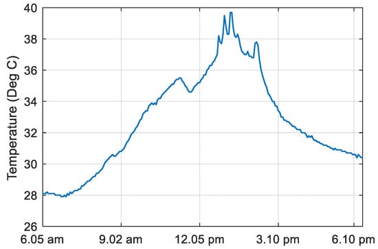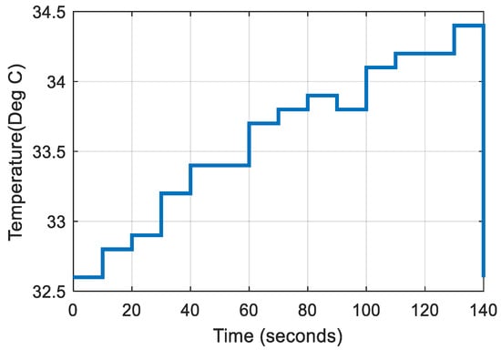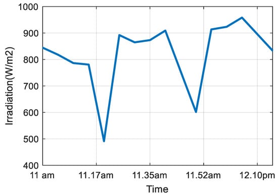The effectiveness of a solar-powered DC-DC converter employing the linear line–slope interpolation technique is examined using real-time data samples where both temperature and irradiance values fluctuate dramatically. Irradiance and temperature on a specific day in the last week of April 2022 from Kollam, India (9.02 N, 76.91 E) are used for the analysis under rapidly changing environmental circumstances and are shown in Figure 16 and Figure 17, respectively. Between 10:00 a.m. and 12:30 p.m., the irradiation varies dramatically. Fourteen data samples are collected at equal intervals between 11 a.m. and 12:20 p.m. for the analysis. Figure 18 and Figure 19 demonstrate the fluctuations in irradiance and temperature across the given time period. Figure 20 and Figure 21 show the changes in temperature and irradiance, which are assumed to be occurring every 10 s for simulation purposes. Figure 22 and Figure 23 illustrate the variation in the duty ratios of switches S1 and S2. Figure 24 and Figure 25 depict the generated output voltage and power, respectively.