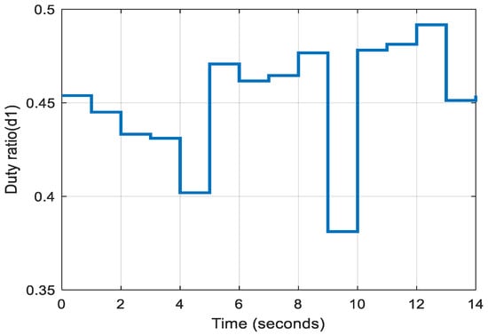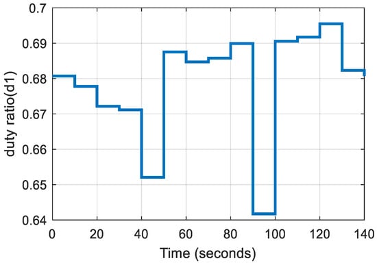 Duty cycle of switch S1 of the high-power converter under rapidly varying PV inputs.