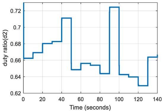 Duty cycle of switch S2 of the high-power converter under rapidly varying PV inputs.