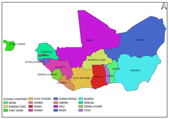 Aiming to “promote cooperation and integration leading to the establishment of an economic union in West Africa in order to raise the living standards of its peoples, to maintain and enhance economic stability, foster relationships among Member States and contribute to the progress and development of the African continent,” the Economic Community of West African States (ECOWAS) was created on 28 May 1975 by the Treaty of Lagos. The development environment has undergone significant changes over the past 10 years on a continental and global scale, which have had a significant impact on the dynamics of the integration process in western Africa. The ratification of the Sustainable Development Goals (SDGs) and the Addis Ababa Action Agenda on finance for development, in addition to the adoption of the African Union’s Agenda 2063, represent a significant shift in the development priorities of ECOWAS Member States. In addition, the ECOWAS countries consider the Paris Climate Agreement, which was adopted in 2015 to protect the planet from the harmful effects of climate change, to be major priorities [9]. There are 15 countries, as shown in Figure 1, that make up the Economic Community of West African States (ECOWAS), all of which are found in western Africa. These nations are linked geographically and culturally, and they also have common economic interests.