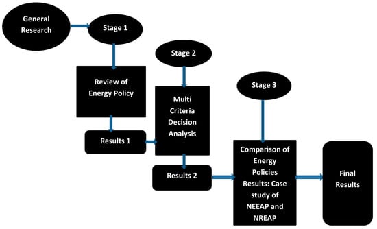 This study’s approach was based on a review of energy policy, analysis of the policies using a multicriteria decision-making process, and comparison, as shown in Figure 2. The first stage (Stage 1) was to collect and aggregate data for subsequent policy analysis, which was done during the energy policy review. First, a detailed evaluation of ECOWAS’s policies and target status was conducted. The widely used approach of systematic review was used to provide insight from current resources of ECOWAS’s energy condition in order to develop a credible, dependable, and legitimate review. The second stage (Stage 2) is the policy analysis with multicriteria decision-making. The third and last stage (Stage 3) is the comparison of the progress of the two key policies in renewable energy and energy efficiency—the National Energy Efficiency Action Plan (NEEAP) and National Renewable Energy Action Plan (NREAP)—in the region.