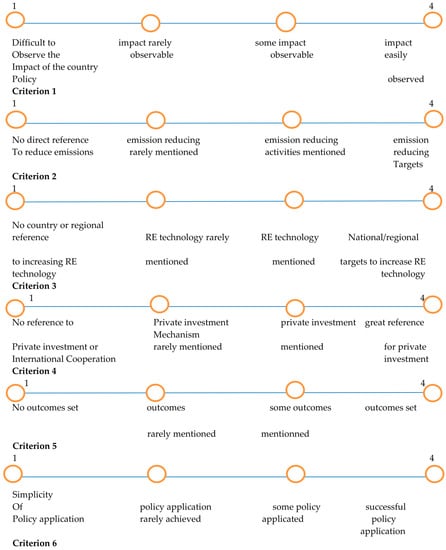Each policy was assessed against the criteria using a scoring system of one (low) to four (high), as indicated in Figure 3, in order to gauge the advancement of each criterion for the pertinent policy. For all criteria, the “high” value was the ideal option.
