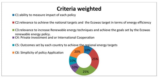 We assigned weights to each of the criteria to show how important they are to the choice. The relative importance of each criterion to the choice is indicated by a weighting in addition to a score. The criteria were selected from the literature review to inform the direction of our analysis. In considering the criteria, the objective to be reflected in each option was effectiveness in measuring the implementation and resulting impact of the energy policies in the ECOWAS context. The weights were assigned on the basis of a total allocation of 100%. In Figure 4, the breakdown is shown. Criteria 2 and 3 were given a slightly higher weighting than the other criteria (25%), as increased achievement of national and ECOWAS energy efficiency and renewable energy technology targets, as well as achievement of ECOWAS renewable energy policy targets, should drive the transition factors to effective policy mechanisms. Criterion 6 was weighted at 20% because successful implementation is important for progress and transition. The other three criteria (1, 4, and 5) were each given a 10% weighting. The total value is calculated by adding the weights and scores for each option. Then, based on the weight and score given to each policy, an overall value is awarded to each one.