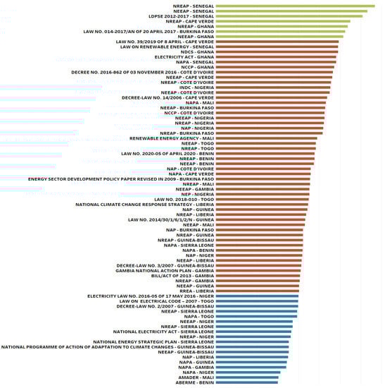 Google Scholar, Science Direct, Research Gate, and other search engines were used to discover sources and also reliable data and information to select the 75 policies of the 15 ECOWAS Member States, as well as local, regional and international official organization websites, such as the ECOWAS Centre for Renewable Energy and Energy Efficiency (ECREEE), World Bank, International Energy Agency (IEA), and International Renewable Energy Agency (IRENA). On the basis of the scientific literature, journal articles, laws, executive orders, presidential decrees, official energy sector websites, research platforms, a study of important documentation was carried out when analyzing the selected policies.