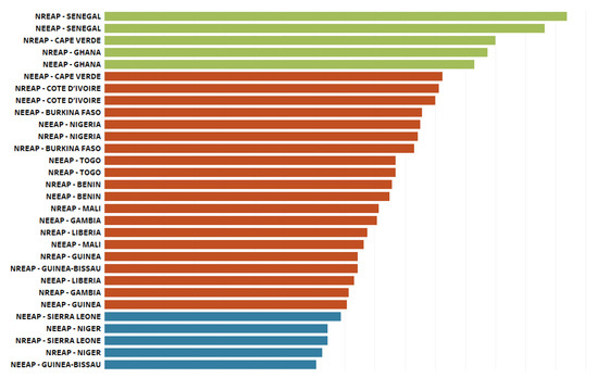 The comparison of energy efficiency and renewable energy policies was supported by the results of multicriteria decision analysis. A comparison of the regional action plans in the two sectors was done because energy efficiency and renewable energy sources are two key factors to successfully transition to a low-carbon economy in the ECOWAS region. Based on the results of the multicriteria decision analysis used, this small comparison will allow us to see the countries of the region whose policies have obtained the best progress score for the NREAP and NEEAP.