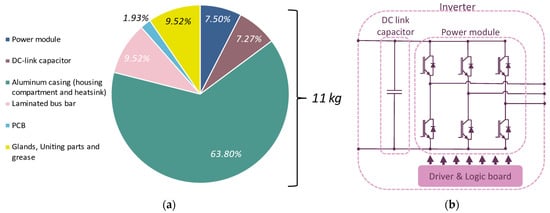 (a) Mass diagram of a 150 kW inverter with 450 V DC bus, total weight = 11 kg; (b) Electrical diagram.