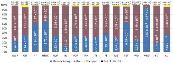 Product manufacturing is also an important component since it takes precedence over four different impacts. More specifically, it exceeds 60% in the following categories: human toxicity (≈61%), non-cancer human toxicity (≈64%), freshwater ecotoxicity (≈62%), and mineral resource depletion (≈94%). The discussion on manufacturing is developed in the following sections.