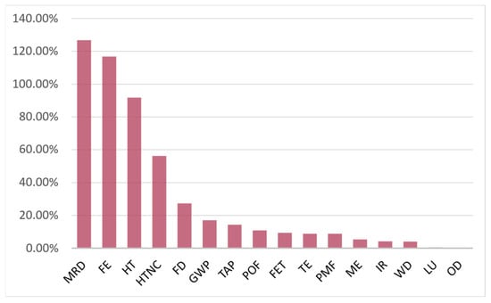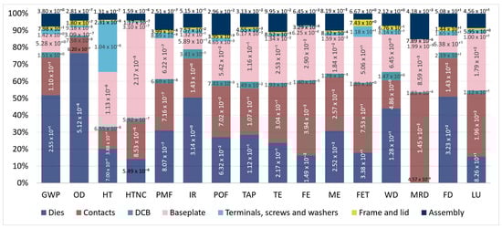 Figure 7 shows the environmental impacts of the power module present inside the inverter. The assembly oscillates between ≈12% (POF) and ≈3% (FET), caused mainly by using soldering paste. Frame and lid are lower-impact parts, with the use of polyphenylene, which is a thermoplastic. Terminals, screws, and washers exert minimal impact, except for HT at ≈30%, due to the use of raw material, steel. In contrast, DCB stagnates at around 3% (IR ≈ 5%, MRD ≈ 1%), also due to the use of raw material, copper, but also because of the inert gas used in the furnace to assemble the copper with the ceramic, i.e., nitrogen.