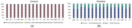 Standardized environmental impacts of contact (a) and baseplate (b) processes for the power module (150 kW), given the European Commission recommendations for choosing impact categories [27]. Abbreviations are presented in Table 1.