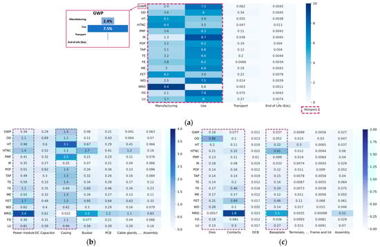 The hotspots for the power module, aluminum housing, and usage are all visible in Figure 10 due to darker shading. For example, a 10% variation in the power module causes a 0.34% variation in climate change (GWP), 1.4% HTNC, 3.4% MRD, etc. This output serves to ascertain the weight of the subpart on the impact, e.g., 3.4% GWP, 14% HTNC, 34% MRD.