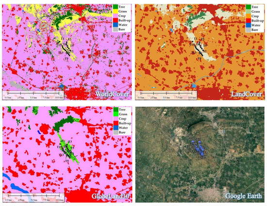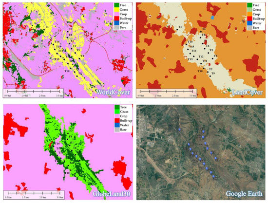 The 10 m resolution surface cover data products, which are also based on Sentinel satellite data, include Google’s DynamicWorld product coverage [19]. Water, trees, cultivated land, and other coverage types are divided into nine categories, with an overall accuracy of 71.3% Landcover coverage [20]. With an overall accuracy of 85%, the coverage type includes nine categories, such as water, grassland, ice, and snow. Although LandCover appears to have higher overall accuracy, studies have shown that WorldCover has higher accuracy and LandCover accuracy is lower at lower cell resolution (100 m2) [21,22,23].