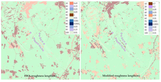 To use the ESA WorldCover surface cover data set in wind resource assessment, the mapping relationship between surface cover data and surface roughness must be established. The mapping relationship between ground coverage and roughness length is established using the European Wind Atlas [26] and the New European Wind Atlas [27], and the roughness length is adjusted based on the local actual situation (Table 1) [28,29,30,31,32]. Expand the 10 km range from the site location to the east, west, north, and south to account for the impact of upstream surface cover on the experiment [33]. When the wind blows over the top of the mountain, a pressure difference exists between the windward and leeward sides of the mountain, increasing friction loss and effective roughness length [34]. Because there is no dense vegetation near the wind measurement site, displacement height is not required. The EWA roughness length value and the improved roughness length value were used to assign the land cover data to generate the roughness length map that the program could read (Figure 3).