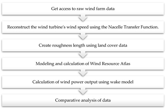 The Yingchen wind farm, which has been connected to the grid, is chosen as the actual measurement project in this paper. According to this project’s feasibility study report (FSR), the Openwind [35] wind farm design software is also used for modeling, the WindMap [36] wind flow model is used to calculate the wind flow field, and the Eddy-Viscosity wake model is used to calculate energy. The initial data uses the same wind measurement data, surveying and measured topographic map, and the same uncertainty table. On this basis, the roughness length is calculated using EAS land cover data, and the energy is calculated using the Deep Array EV wake model and the ASM-EV wake model. It should be noted that the wake model’s general parameters use the same settings, while the non-general parameters use the default parameters without modification. The experiment’s energy data is compared to the wind farm feasibility study report data and the wind farm’s actual operation data. On one hand, it confirms that WorldCover data can be used in the wind power industry. On the other hand, it compares the errors of different wake models. The flowchart process will be used for verification in this paper (Figure 4).