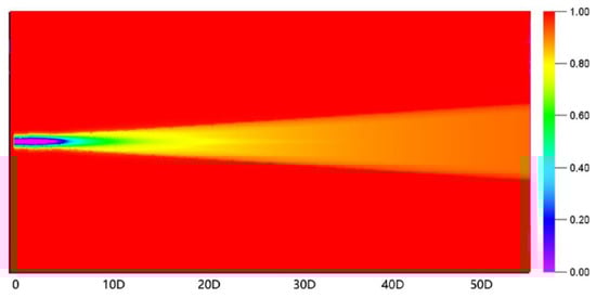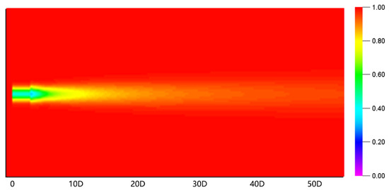 Figure 6 depicts the wake behind a single wind turbine as simulated by the Deep Array EV wake model, which predicts wake velocity deficits using a Gaussian distribution in the near-wake region and a linear extension in the far-wake region, and it is run by Openwind. The X-axis in the figure is a multiple of the wind turbine impeller’s diameter(D), and the background-free wind speed is 10 m/s, which is displayed in red. The legend assumes that the background wind speed is 1(100%), and different colors correspond to different multiples of that speed.