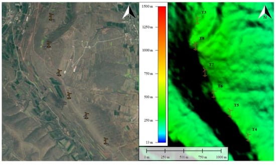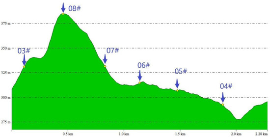 The wind blows from the 4# wind turbine to the subsequent 5#–8# wind turbine. Combining with Figure 9, it is also discovered that the altitude of the 8# wind turbine has a large drop from the wind turbine arranged in front of it, and the altitude difference from the 7# is 51.38 m, the altitude difference with the 4# wind turbine is 91.96 m, and the wind will eventually reach the 8# wind turbine through continuous climbing. If the free flow wind passes through the 4# position and reaches the 8# position, the wind speed should be continuously increased by the terrain.