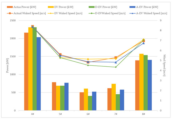 The power generation calculated by the ASM Eddy-Viscosity wake model is the closest to the actual energy, as shown by the summary of the calculation results in Table 6. In the third row, the difference between the Deep Array wake model and the Eddy-Viscosity wake model becomes apparent. The Eddy-Viscosity wake model’s simulated wake flow has begun to recover greater than the loss at the fourth wind turbine 7#, and power generation has begun to rise. 8# The wind turbines’ comprehensive geographical location and simulation calculation of the wake flow show that the power generation has a higher recovery than the previous three wind turbines 5#, 6#, and 7#. The Deep Array wake model simulation also shows energy recovery for the 7# wind turbine. Greater than the loss, but recovery takes longer. The ASM Eddy-Viscosity wake model simulation data trend is consistent with the previous two models. Because of its top-down simulation method, the energy lost in the wind farm can only be supplemented by the turbulent kinetic energy above, reducing wind resistance and increasing turbulence. reflected more clearly. The energy of the 5# and 6# wind turbines is decreasing, the energy of the 7# wind turbine is being restored, the energy of the 8# wind turbine is being less affected by the wake, and the energy supplemented from the environment is becoming more sufficient. Figure 10 depicts the average wind speed and wind turbine output power during the analysis period.