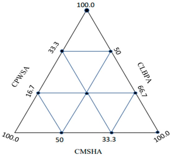 Simplex Lattice Design is a boundary point design used to examine the blending of multiple components. This design is appropriate for 2 to 30 components. A simplex-lattice mixture design of degree m consists of m+1 points with equally spaced values ranging from 0 to 1. If m = 2, the possible fractions are 0, 1/2, and 1. For m = 3, the alternatives are 0, 1/3, 2/3, and 1. The points include the pure components as well as enough points between them to approximate an equation of degree m, and all of the design points are on the boundaries of the simplex [31]. In this study, a {3, 3} simplex lattice design that contains ten (10) blending coordinates (Figure 1) was used for the development of an effective CHC. The experimental region and the distribution of design run over the simplex region are shown in Figure 1.