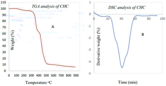 (A) TGA thermogram of CHC, (B) DSC thermogram of CHC.