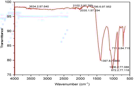 The FTIR pattern for the catalyst sample is shown in Figure 4. The characteristic absorption peaks of CHC are observed by IR spectra [10]. The major peaks of 1397.8 and 1036.2 cm−1 are associated with the asymmetrical bond of C=O and C-O groups in . This may be due to the absorption CO2 onto the surface of the metal oxide, thus suggesting the presence of the oxides of Ca, Mg, or K in the catalyst [10]. The absorption peaks at 872.2 and 711.9 cm−1 at the fingerprint region, which are attributed to out-of-plane bend vibration modes, may be due to the presence of -SiO2 isolated vibration in Ca3Al2Si from interaction with Al3+ and Ca2+. Similar interactions have been detected by Betiku et al. [6] and Oloyede et al. [10] for heterogeneous catalysts derived from kola nut pod husk and periwinkle shell, respectively. The FTIR results agreed with the XRF, EDX, and XRD data.