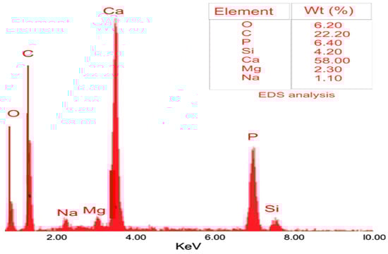 The EDX spectra of the elemental composition of CHC analyzed via EDX are shown in Figure 5. It was observed that Ca had the highest mass fraction (58.0%), thus corroborating the XRF result. Magnesium (Mg) and sodium (Na) were present as trace elements, having a mass fraction of 2.3% and 1.1%, respectively. However, Mg and Na could not be detected by the XRF. This could be a result of the function of the machine. The EDX results of CHC agreed with the EDS result of CPWSA800, CMSHA800, and CLBPA800 catalysts stated by Oloyede et al. [10]. The result also agreed with the XRD analysis of each of the catalysts, showing an appreciable scoring of the oxide of the alkaline metal present, as reported by Oloyede et al. [10]. A similar result was reported for the EDX and XRD results obtained for the cocoa pod husk-plantain peel blend by Olatundun et al. [28].