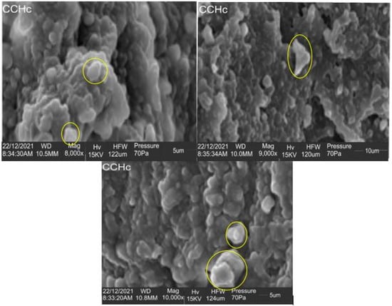 The SEM image of the CHC was viewed at three resolutions (8000, 9000 and 10,000) and the result is shown in Figure 6. The images show the agglomeration of non-uniform particles, clusters of various shapes and sizes, and layered spongy fibrous microstructures that occur during calcination and are revealed in the three resolutions. However, the image at a resolution of 8000 showed a spongier microporous morphology. The bright particles seen in the SEM images might be due to the catalyst’s oxygen-containing substances and may be metal oxides. Aleman-Ramirez et al. [18] also observed an agglomeration with a microporous morphology for a moringa leaves ash catalyst calcined at 500 °C. Similarly, Nath et al. [24] detailed that the SEM character of a catalyst prepared from the Brassica nigra plant for transesterification of soybean oil indicated the agglomeration of particles and layered spongy stringy microstructures [43].