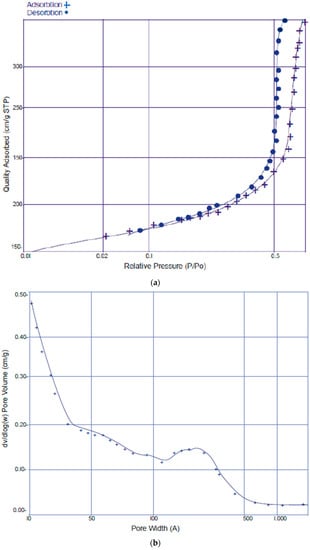 How active a catalyst is will be significantly impacted by the surface area and pore size of all sorts of heterogeneous solid catalysts, in addition to mineral content [44]. The surface area, pore volume, and pore size of the CHC were examined by the BET technique and were found to be 215. 5 ± 3.3 m2g−1, 0.4903 cm3g−1, and 2.022 nm (20.220 Å), respectively. This indicates the presence of a mesopore. The large surface area of the catalyst indicates that the ash sample could have good catalytic activity. According to Betiku et al. [6], a catalyst with a large surface area facilitates increased interaction between reactants and catalyst active sites. Gohain et al. [45] reported similar values of 78.681 m2g−1, 0.349 ccg−1, and 1.6074 nm for surface area, pore volume, and pore radius, respectively, for the calcined Carica papaya stem (CCPS). However, the surface area reported for the CCPS is lower than the obtained value for the CHC. The N2 adsorption-desorption isotherms and pore size distribution for the CHC catalyst are shown in Figure 7a,b. The N2 adsorption-desorption primarily resembles a type IV isotherm with an adsorption hysteresis loop of type H3 that resembles a capillary condensation that occurs in a mesopores, thus indicating that CHC is a mesoporous nanomaterial [28]. The distribution of the CHC pore size was between 1.0 to 100.0 nm (10 to 1000 Å) (Figure 7b).