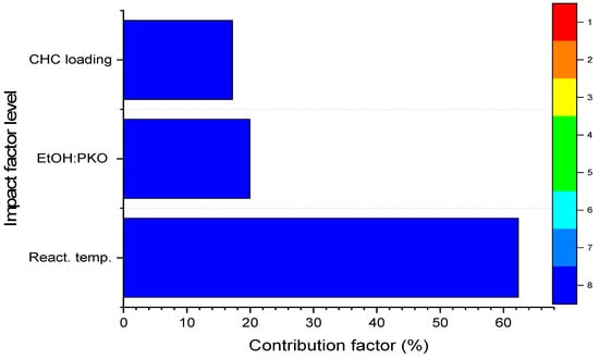 Since the aim in this study was to achieve a maximum biodiesel yield using the developed biobased CHC, the the-Larger-the-better SNR was adopted based on the nature of the variables. In order to enhance process efficiency, an SNR can be used to find the prime level of each parameter as well as its related set of ideal conditions. Unfortunately, the SNR is unable to identify the element that has a major influence on the output, as well as the extent to which each factor contributes to the output [35,36]. This can be understood by using ANOVA to estimate the statistical parameters. The impact factor for each individual variable on PKOEE yield provides information about its effect on the process and may be determined using the sum of squares of the individual components and the overall sum of squares of all input variables using Equation (8) according to Kumar et al. [35] and Oladipo and Betiku [38].
